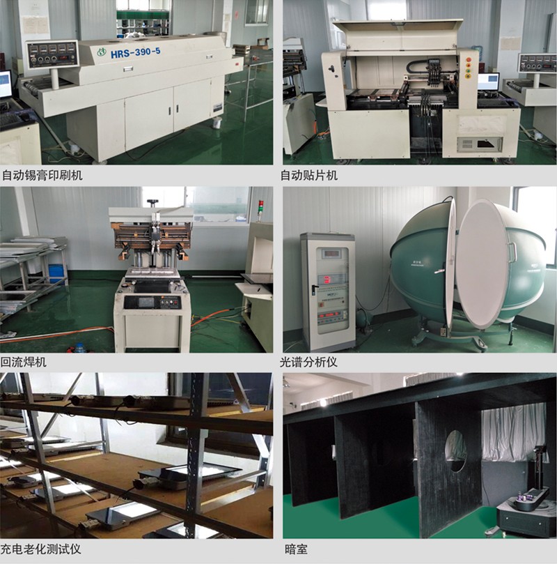 LED燈具車間擁有先進(jìn)的封裝設(shè)備,其中包括--些針對任何封裝的高功率LED光色電分檔的專用生產(chǎn)線設(shè)備,測試成品光強(qiáng),光照度的暗室以及模擬高低溫,沙塵等環(huán)境的檢測設(shè)備。所有成品都必須經(jīng)過各種檢測設(shè)備的嚴(yán)格檢驗(yàn),才可以出廠。